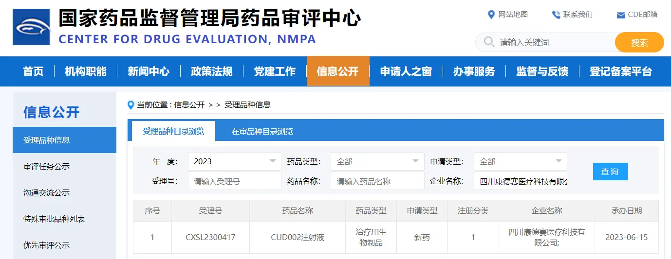 中國國家藥品監督管理局藥品評審中心(NMPA)公示,CUD002注射液臨床試驗的申請已于2023年6月15日獲得受理(受理號:CXSL2300417)。該產品為中國首款基于患者腫瘤新生抗原的mRNA編輯DC腫瘤疫苗。康德賽通過5年耕耘,建立了實體腫瘤的細胞免疫治療平臺CUNDE。CUD002是該平臺中第一個即將進入臨床試驗階段的細胞產品。