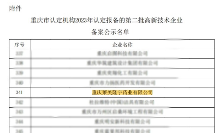 近日,全國高新技術(shù)企業(yè)認(rèn)定管理工作領(lǐng)導(dǎo)小組辦公室發(fā)布了《對重慶市認(rèn)定機構(gòu)2023年認(rèn)定報備的第二批高新技術(shù)企業(yè)進(jìn)行備案的公告》,萊美藥業(yè)控股子公司重慶萊美隆宇藥業(yè)有限公司(下稱“萊美隆宇”)再次通過“高新技術(shù)企業(yè)”復(fù)審認(rèn)定。