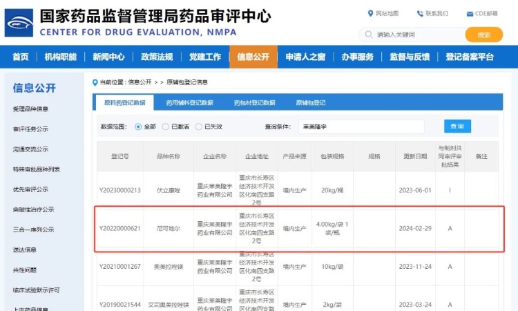 近日,重慶萊美藥業股份有限公司(以下簡稱“萊美藥業”)全資子公司重慶萊美隆宇藥業有限公司(以下簡稱“萊美隆宇”)收到國家藥品監督管理局核準簽發的尼可地爾(規格:4.00kg/袋、1袋/瓶)《化學原料藥上市申請批準通知書》,登記號:Y20220000621,通知書編號:2024YS00170。