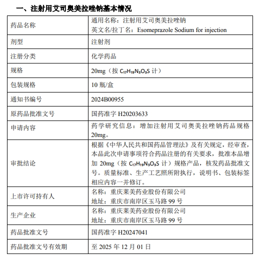 近日,重慶萊美藥業股份有限公司(以下簡稱“公司”)收到國家藥品監督管理局核準簽發的注射用艾司奧美拉唑鈉(20mg)《藥品補充申請批準通知書》,通知書編號:2024B00955。在原批準40mg規格基礎上增加20mg規格,核發藥品批準文號。