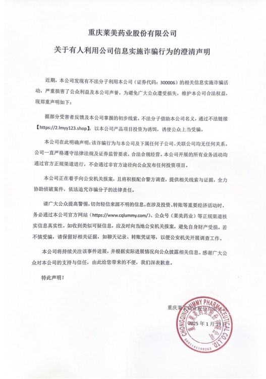 重慶萊美藥業(yè)股份有限公司關(guān)于有人利用公司信息實(shí)施詐騙行為的澄清聲明
