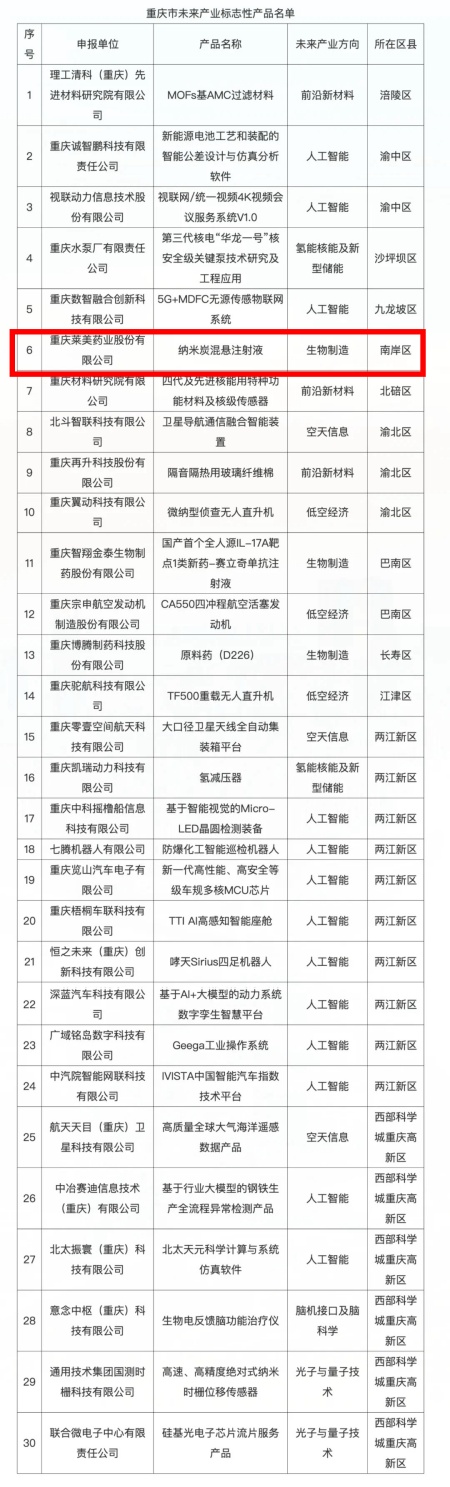 在重慶市經(jīng)信委發(fā)布的這份面向未來的產(chǎn)品名單中,萊美藥業(yè)的納米炭混懸注射液作為生物制造領域的核心技術產(chǎn)品,躋身重慶市首批30個未來產(chǎn)業(yè)標志性產(chǎn)品之列。該名單聚焦前沿新材料、人工智能、生物制造、低空經(jīng)濟等九大未來產(chǎn)業(yè)方向,代表了重慶產(chǎn)業(yè)升級的核心突破點。